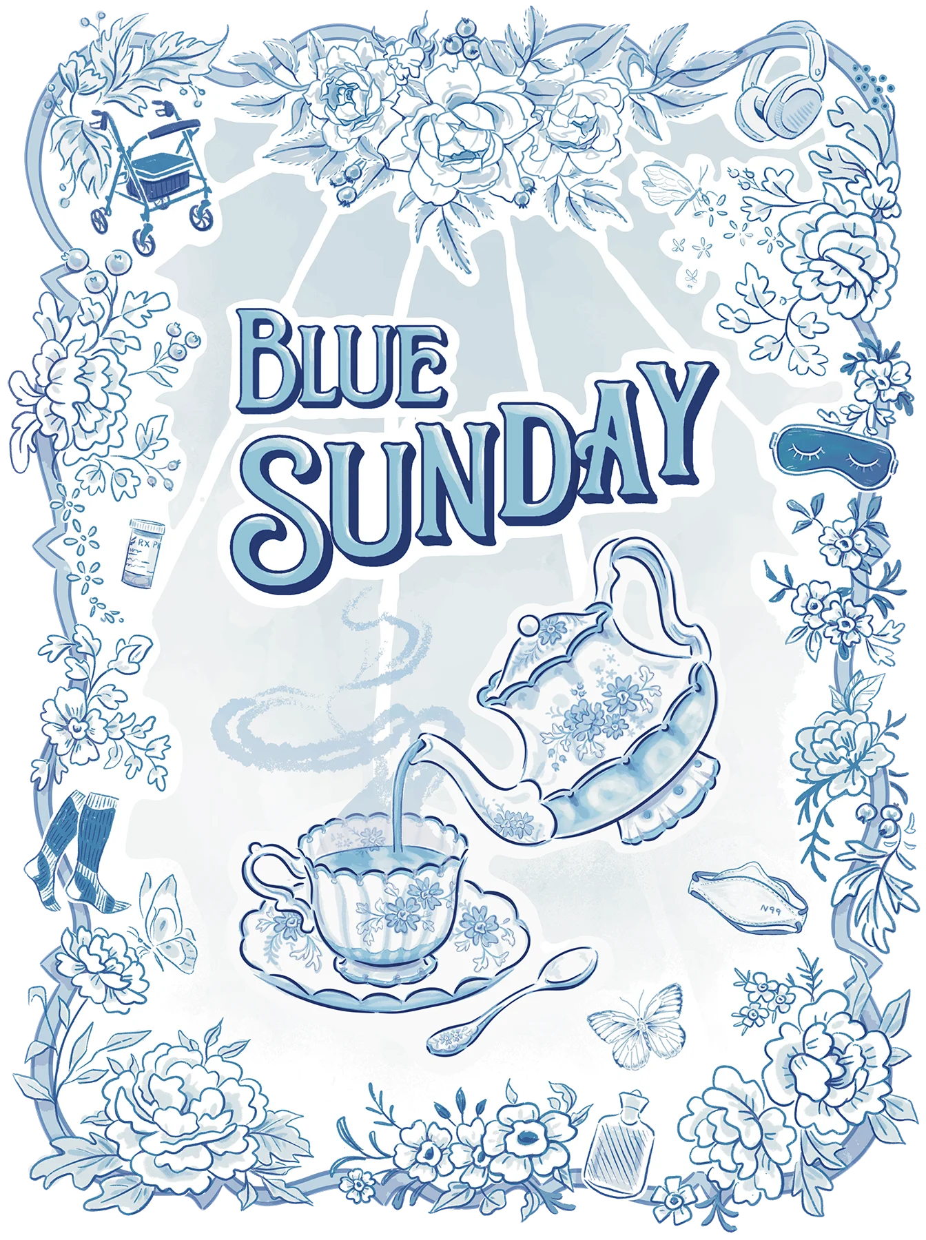 As part of Opera Mariposa’s 2026 Benefit + Awareness Month, Grae created this beautiful design in honour of Blue Sunday, also known as the Tea Party for M.E. Inspired by classic blue-and-white Victorian teacup patterns, the illustration also features a wide variety of chronic illness representation and symbolism – from forget-me-nots to symbolize ME awareness, to a spoon to symbolize the spoonie community, to all sorts of chronic illness essentials woven through the floral border. (See how many you can spot!)